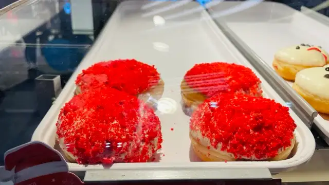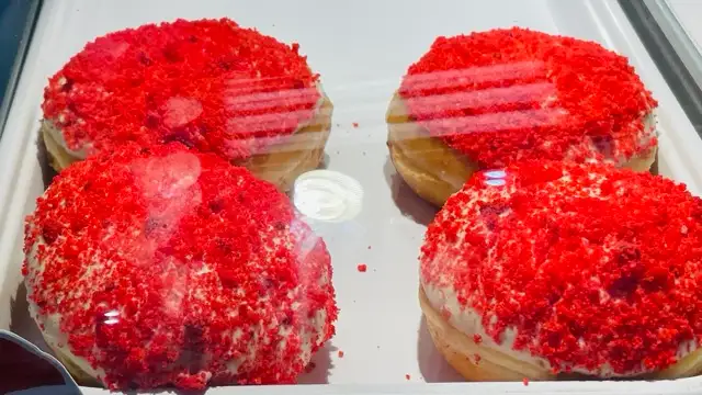 Velvet in redA red velvet filled doughnut covered in a rich white ganache and topped with delicious red velvet cake crumbs is the ideal complement to this festive season. Product details: dry shell, red velvet filling, white ganache, and red velvet sponge; allergens: dairy and gluten